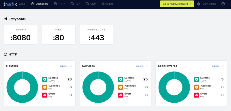 We’re going to use what’s called a reverse proxy. There are a few options in this department, in the past I’ve used nginx and it works well; but my preferred one is Traefik. I’ve been using it for around 2 years with no problems at all. Its configuration isn’t the easiest, but once it has been properly set up it is—in my opinion—the best reverse proxy when working with containers since it can dynamically route traffic to the correct endpoints by reading labels assigned to Docker containers on creation.